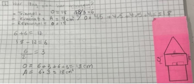 Nästa steg är triangeln. Den har samma omkrets som kvadraten och då vet du plötsligt en sida på rektangeln.