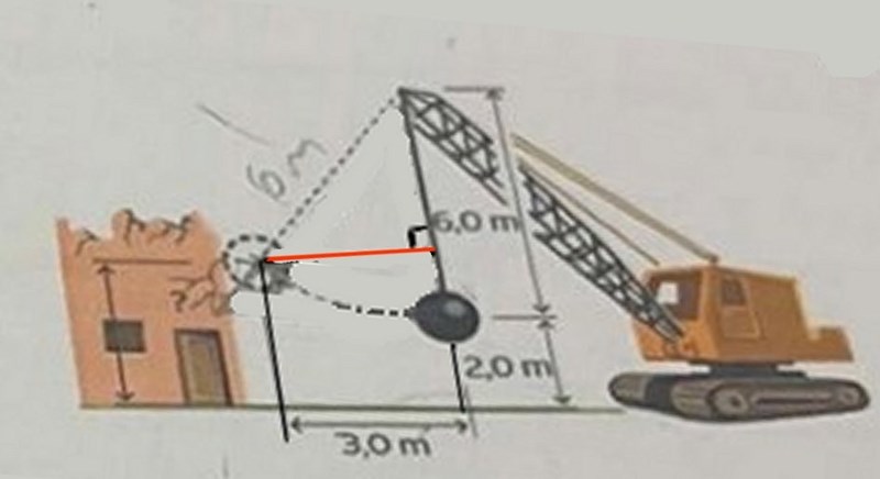 När man river gamla hus använder man ibland en stor pendelkula som likt en gunga slungas mot husväggen. Beräkna, med hjälp av måtten i bilden, hur högt över marken pendelkulan träffar husväggen. Avrunda ditt svar till hela decimeter.