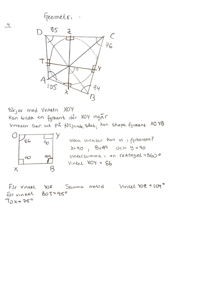 Låt gamma vara en cirkel med medelpunkten i O, inskriven i fyrhörningen ABCD som har vinklarna A,B,C och D i tur ordning lika med 105,94,76 och 85 grader. Gamma tangerar sidorna AB,BC,CD och DA i punkterna X,Y,Z respektive T. Bestäm vinklarna XOY, YOZ, ZOT och TOX.