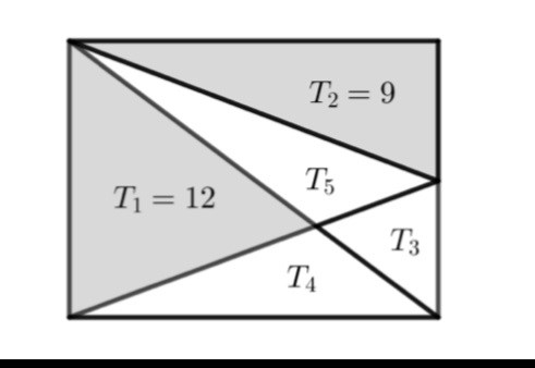 Till att börja med, T1+T5=T4+T3+T2T_{1}+T_{5}=T_{4}+T_{3}+T_{2} eftersom båda leden är lika med halva arean av figuren, vilket ger 3+T5=T3+T43+T_{5}=T_{3}+T_{4}. Å andra sidan är T4+T3=T5+T3T_{4}+T_{3}=T_{5}+T_{3} då båda leden svarar mot areorna av två trianglar med samma bas och höjd, alltså T4=T5T_{4}=T_{5}, som i sin tur betyder att T3=3T_{3}=3. Trianglarna med area T1T_{1} och T3T_{3} är likformiga med likformighetsfaktor 12/3=2\sqrt{12/3}=2 vilket betyder att ena basen av triangeln med area T3T_{3} är hälften av ena sidan av figuren. Alltså måste trianglarna med area T3+T4T_{3} + T_{4} och T2T_{2} ha samma bas. Då de dessutom har samma höjd har de samma area, precis att T3+T4=T2T_{3}+T_{4}=T_{2}. qed