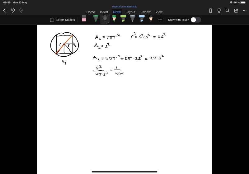 jag fick en avår geometri fråga som jag behöver hjälp på frågan är: räkna ut arean på cirkeln och kvadraten. Hur stor del har kvadraten av cirkeln. Svara i procent.