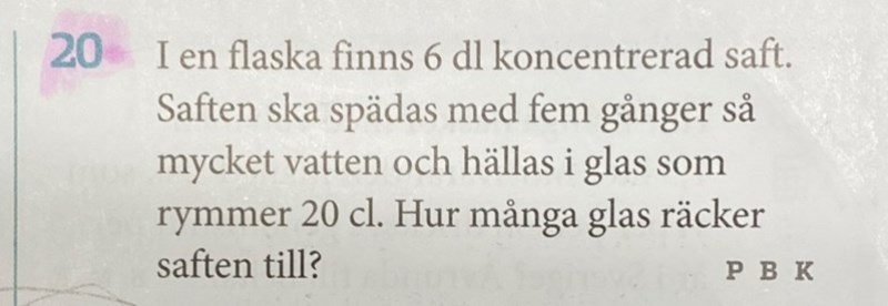 Det blir 6 + 30 dl saft = 36 dl saft.