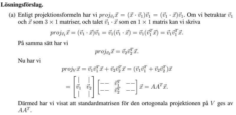 Notera att eftersom den första matrisen (från höger) har ortonormala kolonner så är dess invers dess transponat. Om vi multiplicerar de två första matriserna får vi AAT som begärt i uppgiften.