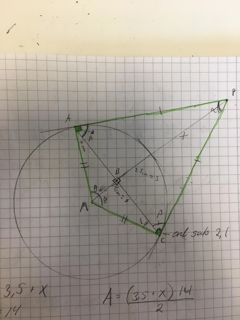 ”Från en punkt utanför en cirkel dras två tangenter till cirkeln. Kordan mellan tangerings- punkterna är 14 cm. Kordan delar cirkeln i två segment, det minsta av segmenten har höjden 3.5 cm. Bestäm aren av den triangel som har tangenterna och kordan som sidor.”
