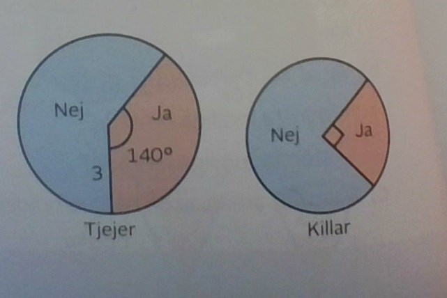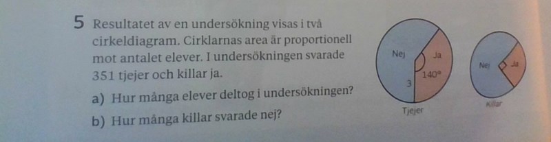 Resultatet av en undersökning visas i två cirkeldiagram. Cirklarnas area är proportionell mot antalet elever. I undersökningen svarade 351 tjejer och killar ja.