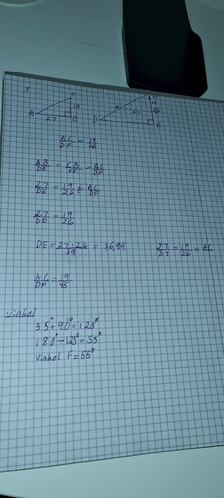 Heej jag behöver hjälp har fastnat på denna uppgift så länge nu. Jag ska beräkna sid DF och vinkeln om trianglarna är likformiga. Vinkeln har jag räknat ut med de är resten jag är osäker på vad jag gör för fel