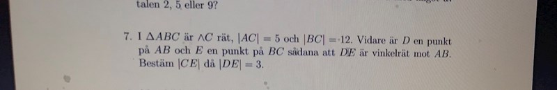 jag vet att man ska använde Pythagoras sats för att beräkna sidan och sedan ska man genom likformighet mellan dessa två trianglar vi får när vi drar en rät linje mot AB.