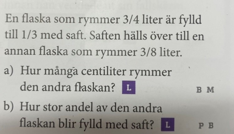 SÄ du har alltsÄ 1/4 l saft, 0.25l, du ska dÄ hÀlla den i en annan flaska som innehÄller 3/8, 0.375 l