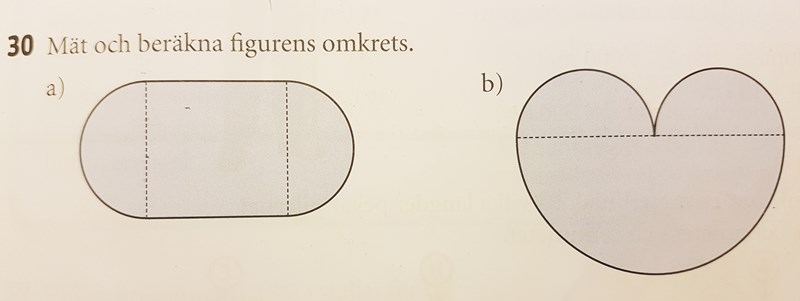 Tips: Omkretsen hos den vänstra figuren kan ses som längden av två halvcirklar plus längden av två rektangelsidor.
