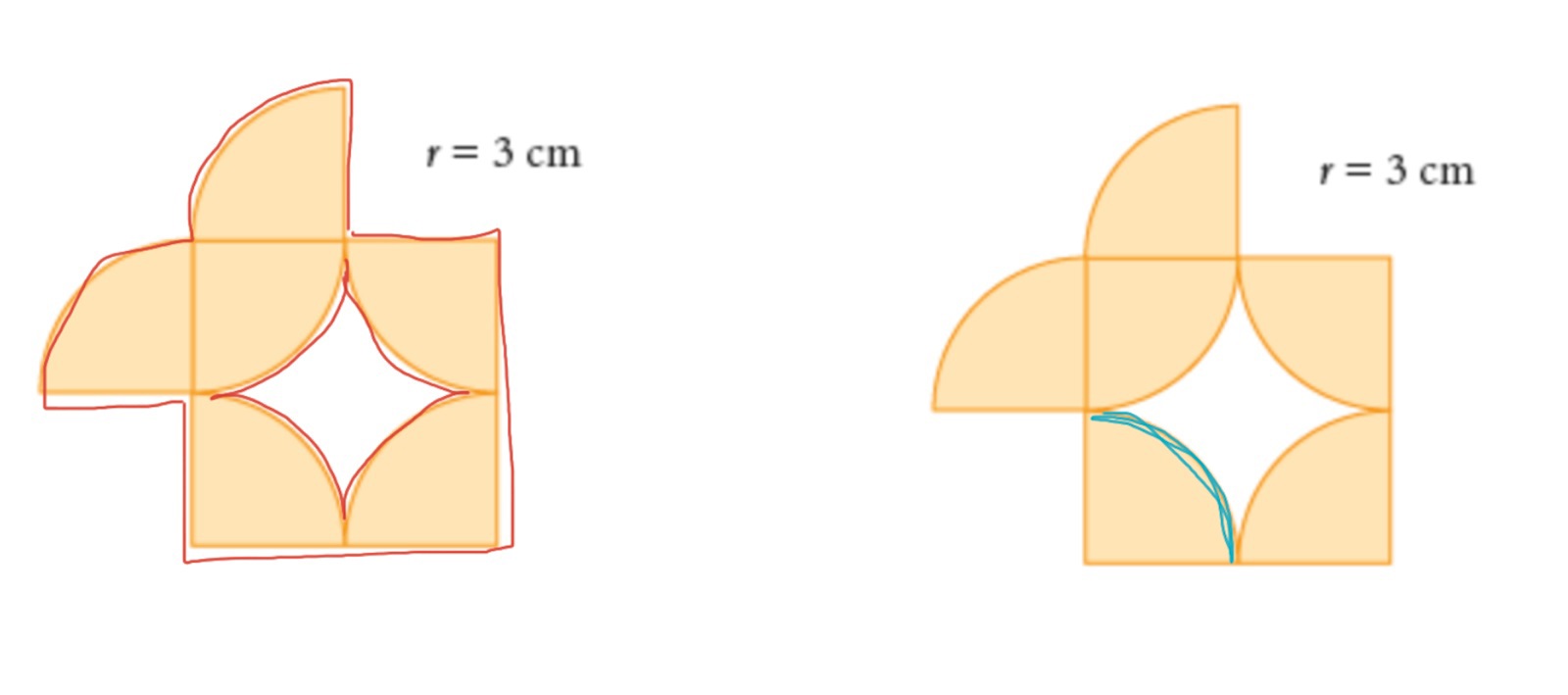 Du behöver inte använda dig av vinklar. Alla de gula områdena är fjärdedelar av en cirkel med radien 3 cm. Om du räknar ut längden på en båge (blått i min bild) bör du kunna få fram hela omkretsen. Jag har markerat figurens omkrets med rött:
