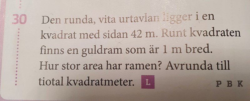 Den runda vita urtavlan ligger i en kvadrat med sidan 42m. Runt kvadraten finns en guldram som är 1m bred. Hur stor area har ramen? Avrunda till tiotal Kilometer.