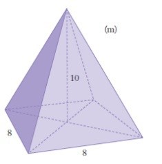 En pyramid har en kvadratisk bottenyta med sidan 8 m. Pyramidens höjd är 10 m.