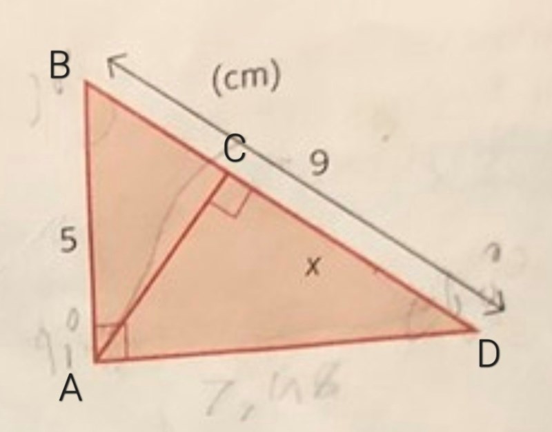 Pythagoras sats ger då sträckan AD genom AD2+52=92AD^2+5^2=9^2, dvs AD=92-52=56=214AD=\sqrt{9^2-5^2}=\sqrt{56}=2\sqrt{14}.