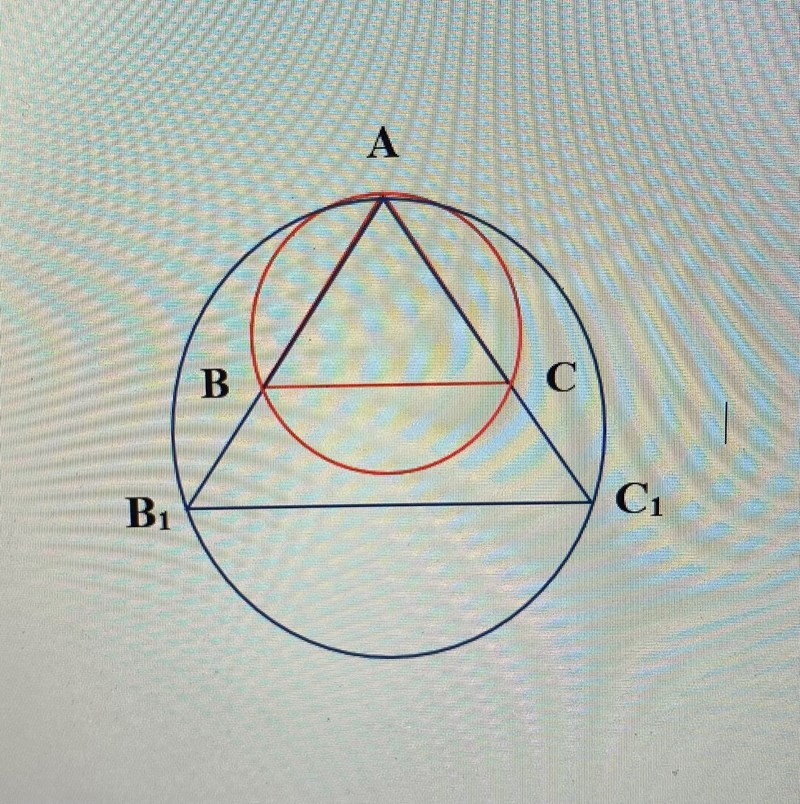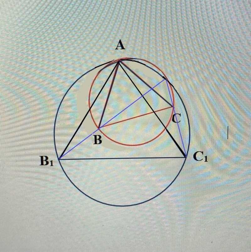 I så fall kan man försöka visa att B1B och C1C bildar en vinkel lika stor som trianglarnas toppvinkel.