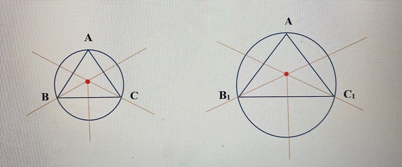 Nu när jag läste en gång till ser jag att en av vinklarna (A) skall vara samma i båda trianglarna, och då verkar det rimligt att EN skärningspunkt mellan de båda omskrivna cirklarna, förutom hörnet A som naturligtvis båda cirklarna går igenom.