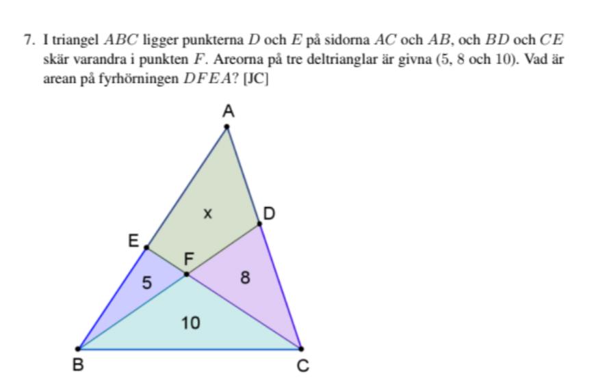 Jag försökte beräkna den total arean för hela triangeln (triangel ABC) och därefter subtrahera med de tre deltrianglarna för att få arean för x. Men vet dock inte hur jag ska beräkna arean för triangeln ABC. Förstår inte hur jag ska lösa denna uppgift....