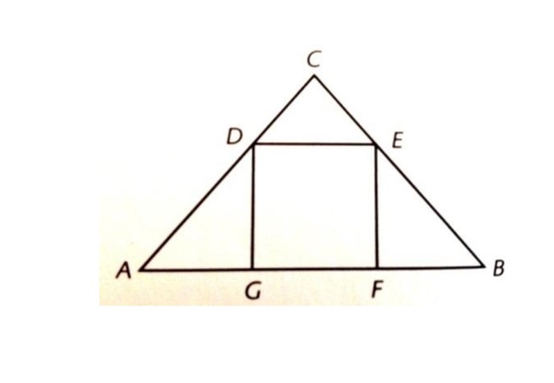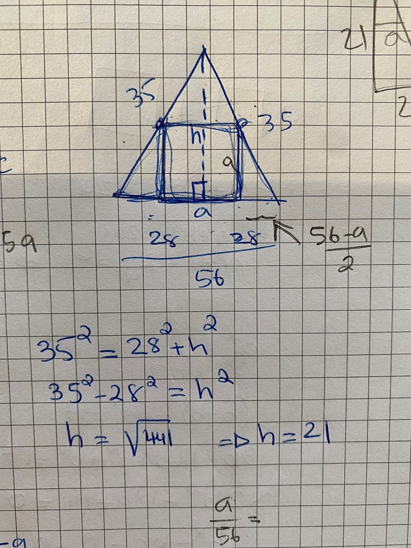 Triangeln ABC är likbent. Dess två lika långa sidor är 35 cm och dess bas är 56 cm. Kvadraten DEFG har sidan a cm. Bestäm arean av triangeln BEF.