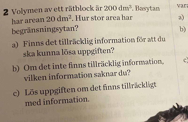Hej! Jag får att a är ”nej, eftersom jag inte vet hur långa basytans sidor är kan jag inte lösa uppgiften.