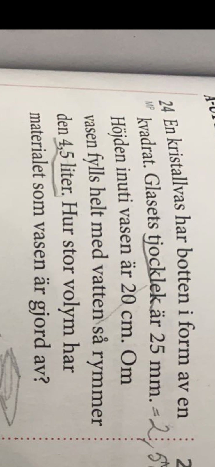 Det blir 4,5 dm3 vasens höjd är 2dm bottenytan måste vara asså volymen är 4,54 dm då är 4,5dm3= 2dmX2,25dm = 4,5dm3 och det är en kvadrat så bottenytans sidor är 2,5 dm