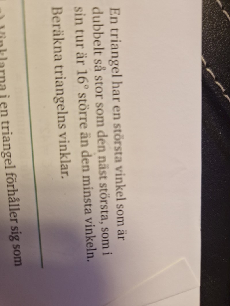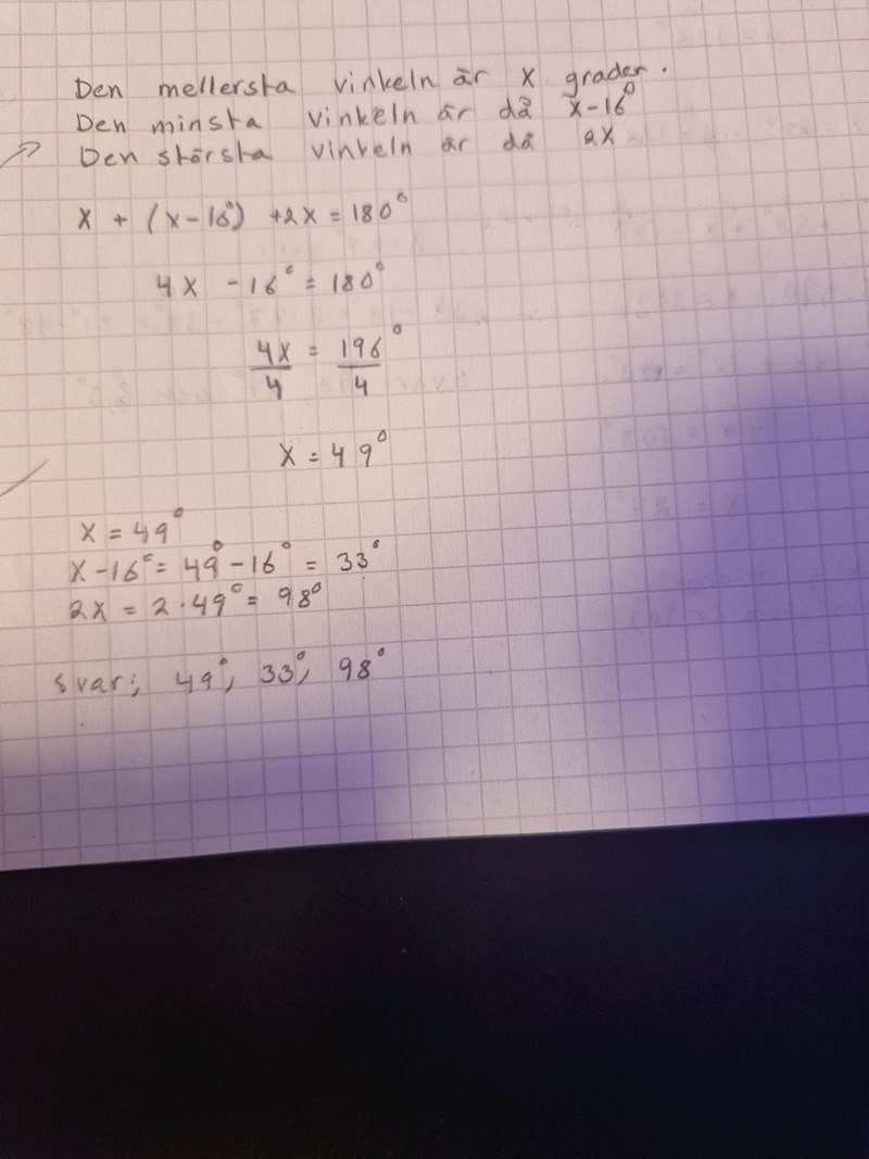 Det bör rimligen vara OK som du skrivit. Logiken kan dock förbättras t ex genom att skriva: ”Antag att den mellersta vinkeln är x. Då är den största 2x och den minsta x-16”.