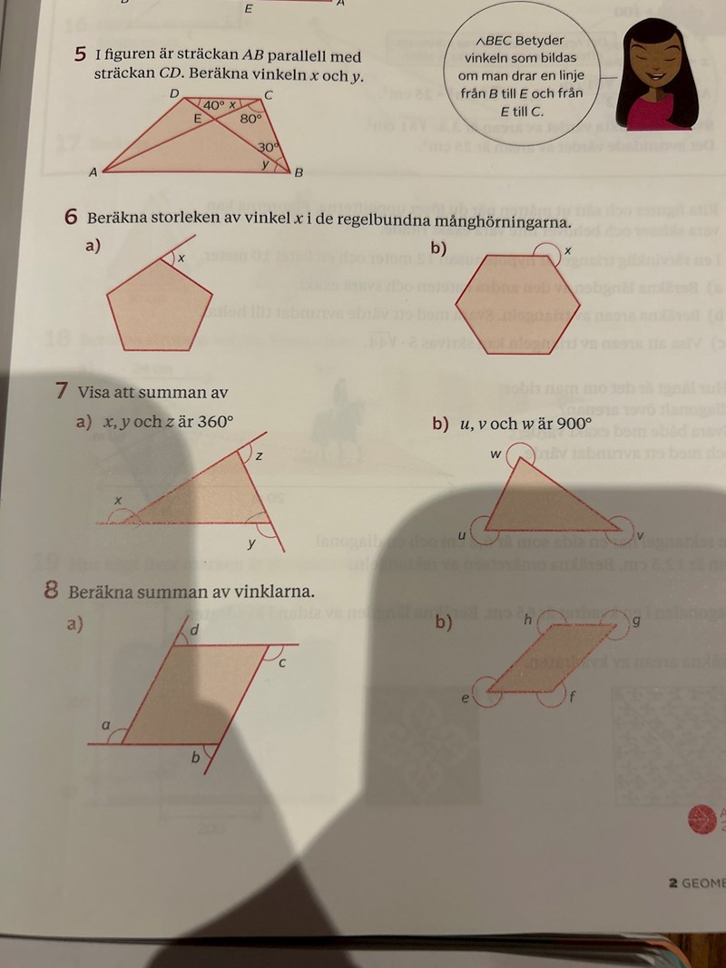 fner skrev:Vi börjar med upg 6. Vad vet du om vinkelsumman i en femhörning?