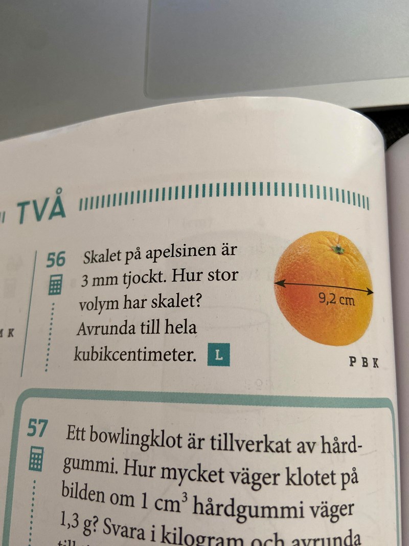 Hur har du börjat? Vilken volym har hela apelsinen? :)