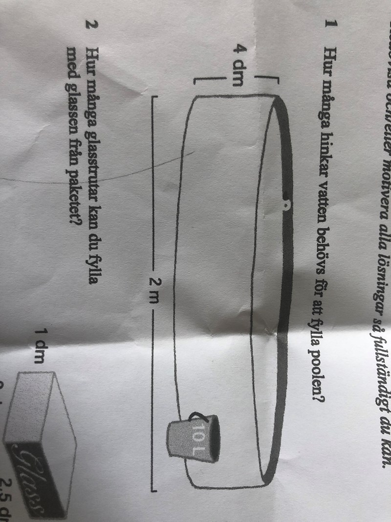 Vid den ritade poolen finns en hink som rymmer 10 l och frågan är alltså hur många sådana hinkar som poolen kan fyllas med.