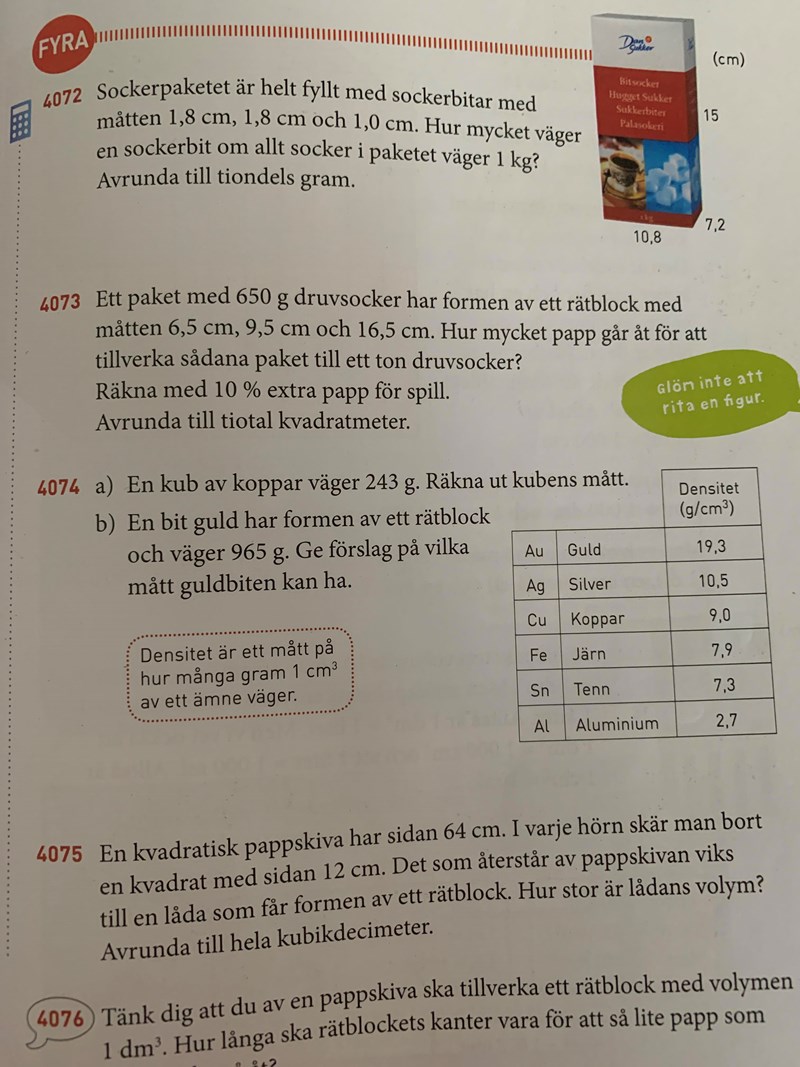 I den här uppgiften handlar det inte om innehållet i paketen (sockret) utan om paketen själva, hur mycket papp som går åt för att tillverka dem. Så volymen är inte intressant. Börja med att rita hur paketet ser ut om man vecklar ut sidorna. Skriv in måtten. Räkna sedan ut sammanlagda arean.