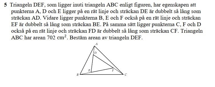 Jag gick igenom geometriuppgifterna på antagningsprov till Danderyds matematikgymnasium och fastnade på flera sätt för en av dem. Andra kanske tycker att den är enkel; jag fick stora besvär. Men när jag väl hittade en lösning blev uppgiften skojig och figuren intressant för egenskaperna som framkom. Uppgiften kan lösas utan en enda beräkning eller införande av beteckningar (utöver en enkel division på slutet för att bestämma arean), bara genom att rita in ett antal sträckor och betrakta de uppkomna småtrianglarna. Enkelt och klurigt på samma gång, som jag tycker att en bra kluring ska vara. Det är därför jag vill dela den vidare.