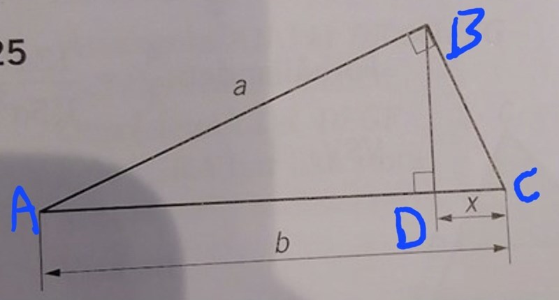 Eftersom man får x = c2/b är det bara att byta ut c2 mot b2-a2 (Pythagoras).