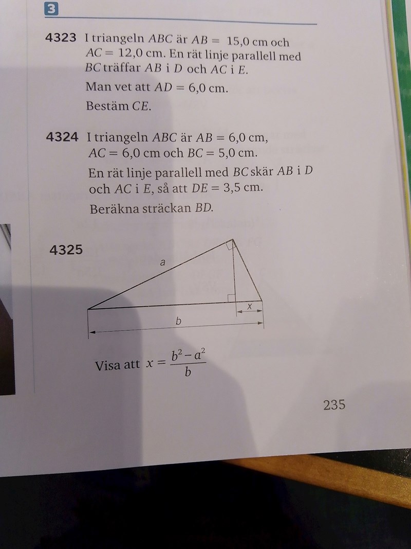 4325) Jag undrar om man ska använda Pythagoras sats för ta reda på X? Eller ska man utnyttja ev likformighet? Jag tycker inte något av alternativen verkar passa här?