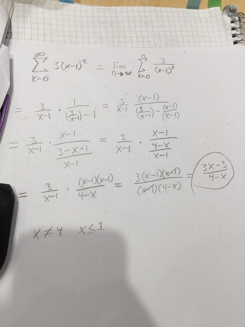 Hej, behöver lite hjälp med geometriska serier. Jag ska bestämma alla x för vilka den geometriska serien(infogat nedanför) är konvergent och beräkna summan. Har infogat min lösning nedanför men är osäker på om det är rätt eller fel.