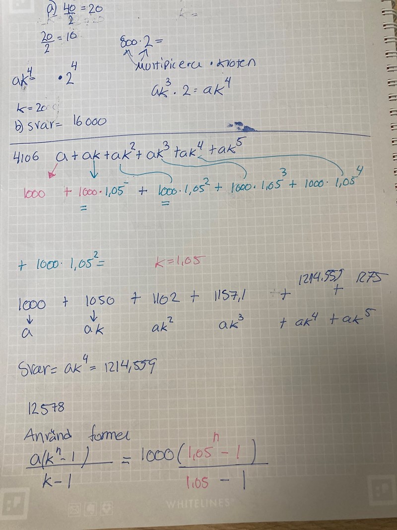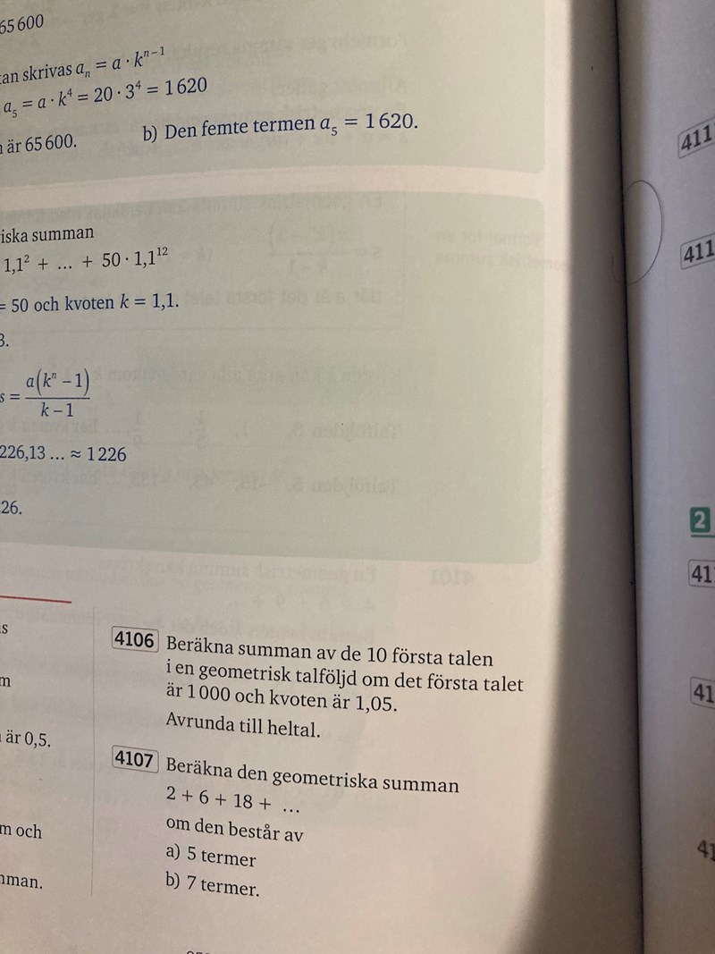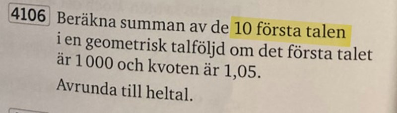 jag provade en beräkning & sen tittade i facit så förstod att jag gjort fel, så jag skrev av summa formeln, hur får jag fram talet n? Ska jag tänka antal termer. T.e.x 5? Jag vet att n = antal termer. Om jag sätter n = 5, får jag ett annat svar än facit. Facit säger: 12578