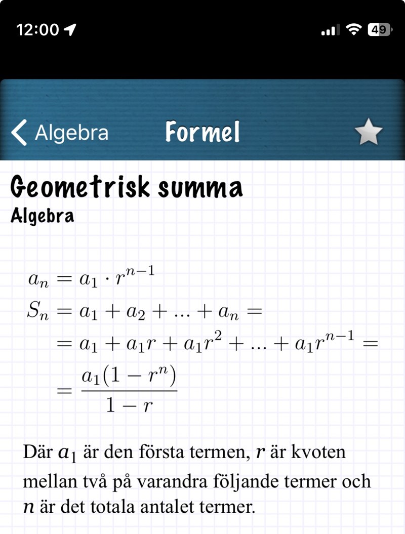 Undrar också hur jag ska ställa upp talet. Är det s=a1(k^n-1) / (k-1) eller någon annan formel?