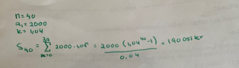 Kristin är 25 år och bestämmer sig för att ta en pensionsförsäkring. Av ett försäkringsbolag får hon veta att den garanterat lägsta årliga räntesatsen är 3%. Hon bestämmer sig för att spara 2000kr i början av varje år. Hon tänker göra den fösta inbetalningen det år hon fyller 26 och den sista inbetalningen det år hon fyller 65. Hur mycket är hennes pensionssparande värt just efter den sista inbetalningen om räntesatsen är 4%? Skatt på sparandet betalas först när pensionen betalas ut.