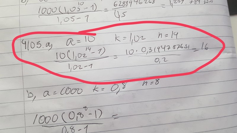 a= 10, k=1,02, n = 14, när jag ställer upp det enligt formeln a(kn-1)/k-1 blir det ungefär 16, svaret är 160, hur kommer det sig?