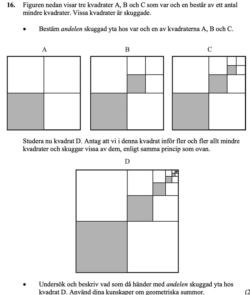Yngve, det är så jag menar men skrev det lite fel. Jag ser just det mönstret men kan inte komma vidare därifrån. Nästa blir då 1/4 + 1/16 + 1/64 + 1/256...etc men vet inte riktigt hur jag ska skriva ut summan, det är alltid föregående summa + 1/4^n, där n är elementets index. Är det kvoten i så fall? Och om det är, varför får jag inte samma kvot när jag delar två på varandra följande element? Sorry om det är lite otydligt....
