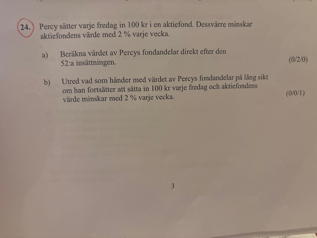 varje vecka lägger han in 100 kr men det minskar med 2% från föregående veckans värde. Hur är detta en geometrisk summa? Det hade det varit om det gick o skriva typ 100•0,98^3 osv men detta är ju inte så frågan är formulerad