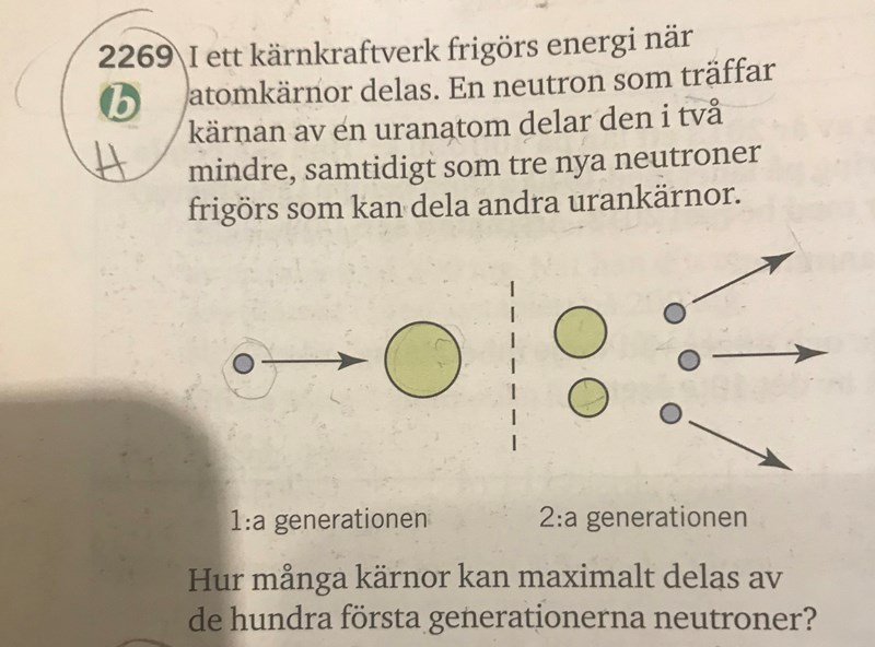 För varje generation kommer det att skapas 3 neutroner från varje atom. I första generationen har vi en. Det är ettan som står i täljaren framför parentesen.