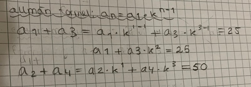Ekvationerna är a1+a1*k^2 = 25 samt a1*k^1 + a1 * k^3 = 50