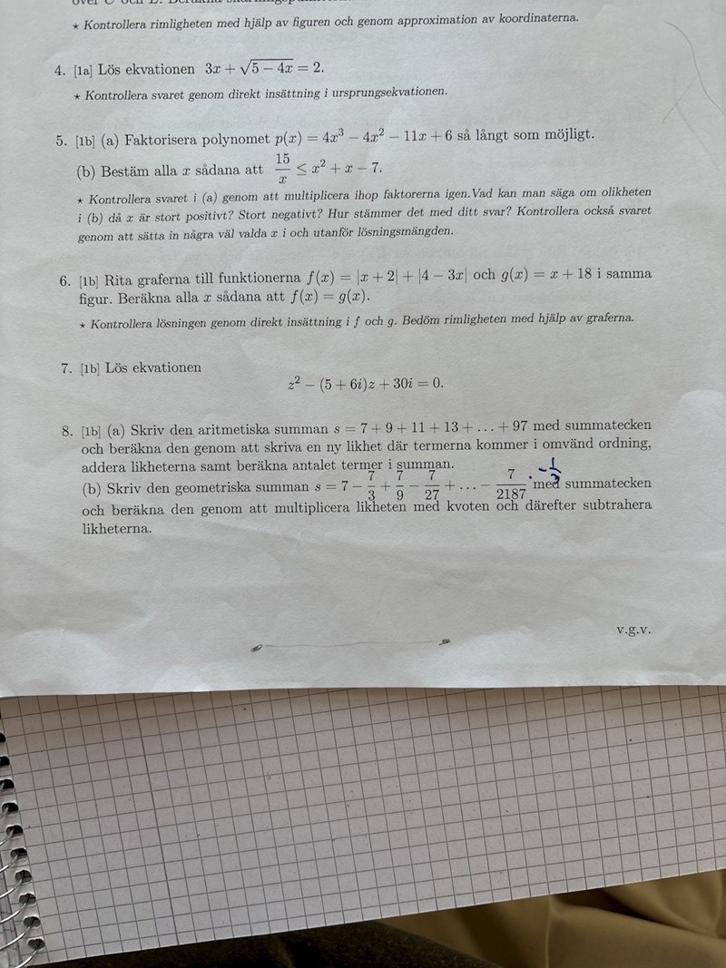 Skulle behöva lite förtydligande bara. Är kvoten i denna talföljd -1/3? Dessutom, så förstår jag inte riktigt varför jag får fel svar. Om jag gör som uppgiften lyder, så tar alla termer ut varandra förutom den första och sista, vilket jag får till 7-(7/3^8). Men det blev inte rätt svar.