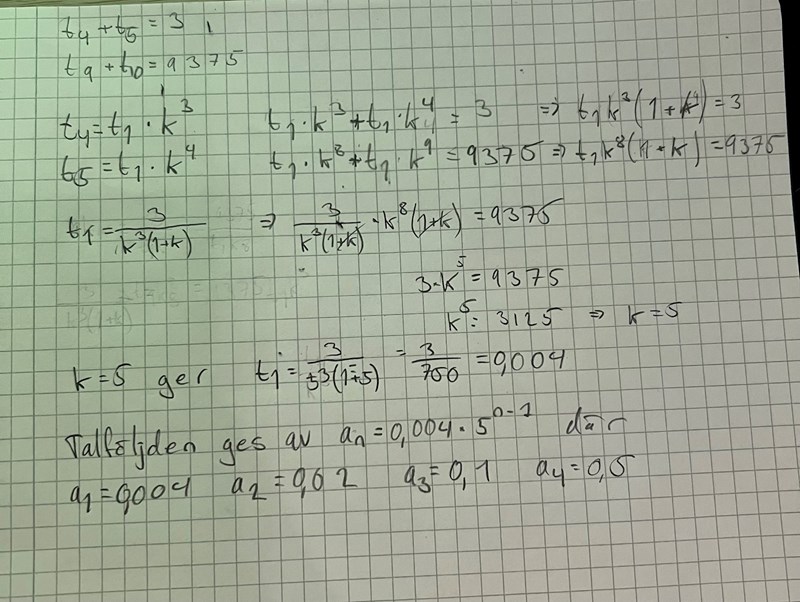 Bra start! Du har ett ekvationssystem med två ekvationer och två variabler. Testa exempelvis att lösa ut t1t_1 ur den första ekvationen och substituera in det i den andra ekvationen