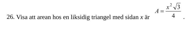 Du behöver varken sinus eller cosinus för att lösa den här uppgiften. Det räcker med Pythagoras sats. Den viktiga ledtråden är att triangeln är liksidig. Om du gör som Bedinsis föreslog och delar triangeln på mitten, så får du en rätvinklig triangel där hypotenusan är x och den ena kateten är x/2. Kommer du vidare?