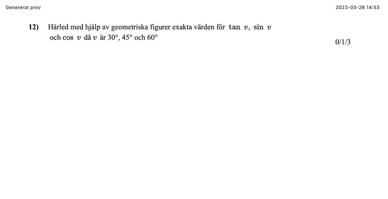en bra start är att rita några rätvinkliga trianglar där en av vinklarna i var triangel är 30, 45 resp 60 grader.