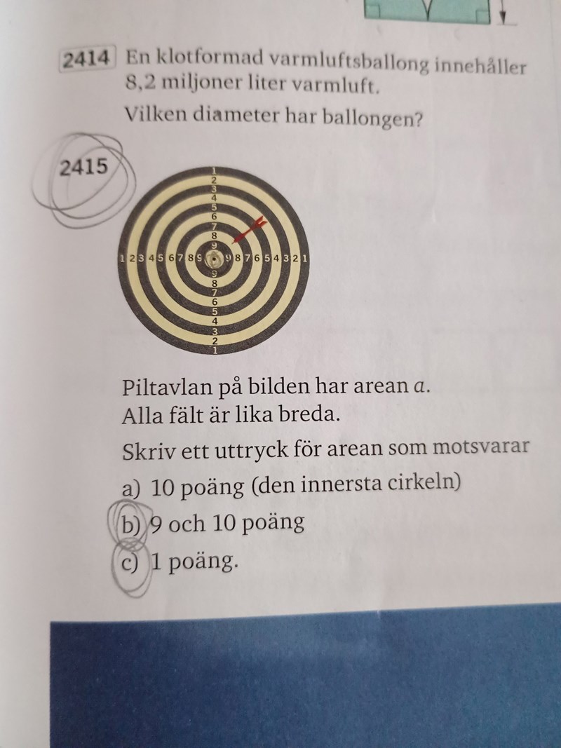 Om du nu dividerar båda sidor med 100π100\pi så får du att r2=a100πr^2=\frac{a}{100\pi}