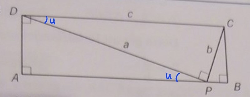 a) Jag förstår inte hur man kan se att trianglarna har ungefär samma storlek (area)? Jag ser att hypotenusan i ADP = lång katet i CPD, men f ö ser jag inga likheter? Hur kan AP vara lika lång som (c)?