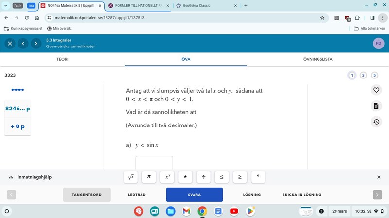 Hej, a) är enkel att lösa utan att skissa, men resterande behövde jag skissa för att se integrationsgränserna osv, så kommer vi alltså få skissa dessa i Geogebra eller ska vi utgå från någon algebraisk metod för att lösa de?
