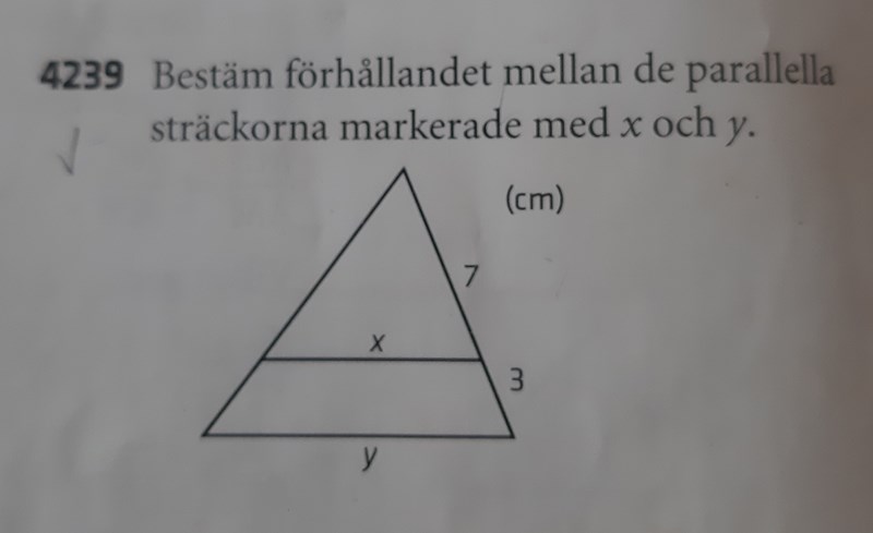 Ifall vi säger att hela triangeln i bilden med bas y cm och högra sidan 7+3=10cm och den andra triangeln vara den med bas x cm och 7cm högersida så kan vi få förhållandet och där är man nog färdig