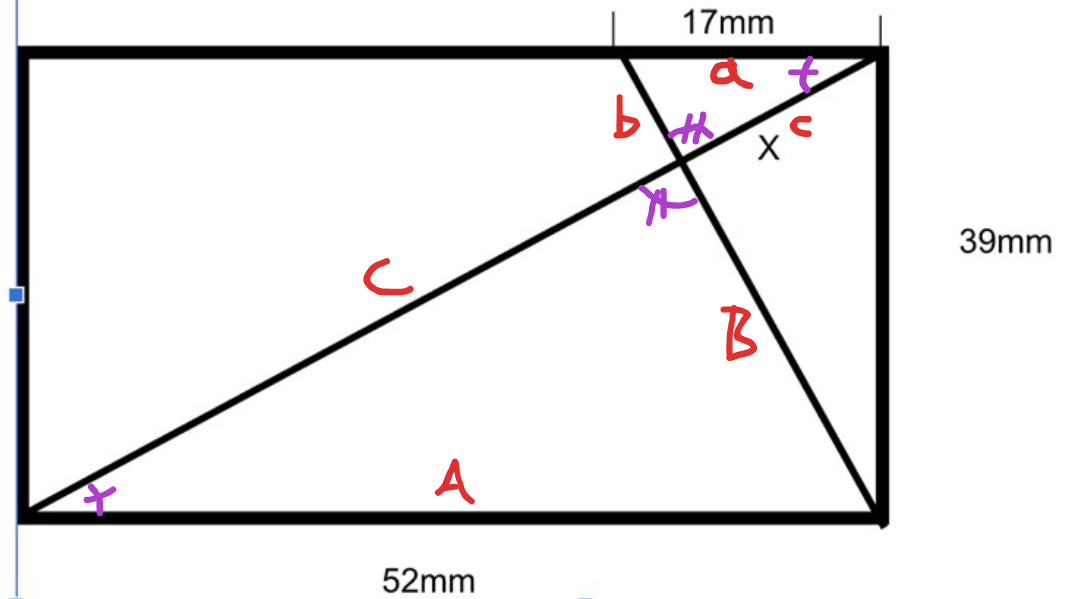 Pythagoras ger att hypotenusan är 65 mm, så vi kan peta in lite värden: