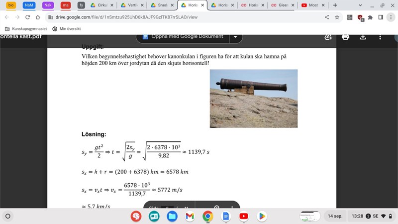 Ta bara resultatet: för att kanonkulan bara ska följa jordens yta behöver den flyga med den första kosmiska hastigheten (där centripetalaccelerationen är lika med g) som är 7,9 km/s.